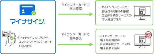住民(申請者)は、ご自身のスマートフォンにマイナサインアプリをインストールするだけで、事前のユーザー登録などを行うことなく、マイナンバーカードで電子署名を行うことができ、自治体は住民の本人確認を行うことができます。