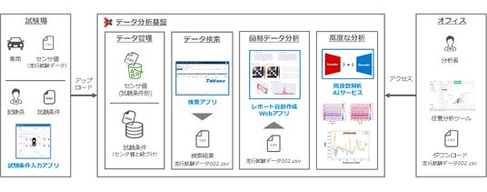 本システムにより、新製品を評価するために収集した走行試験データを、自動で一元管理できるようになりました。また当社の分析者が、収集したデータに対し、内製AIサービスを活用して分析するなど、様々な分析アプローチを試せるようになりました。本システムには、パブリッククラウドのAWS(Amazon Web Services)を用いて構築した“データ分析基盤“が含まれており、アップロードされた走行試験データの管理・検索・簡易分析までの自動化(一部簡素化)を実現しています。 また本システムの一機能に、最先端のAI技術を活用した周波数解析サービスがあります。このサービスにより、自動簡易分析では発見できなかった開発品の特徴(新規性)を把握するための手作業を、AIが支援する体制も整備しています。