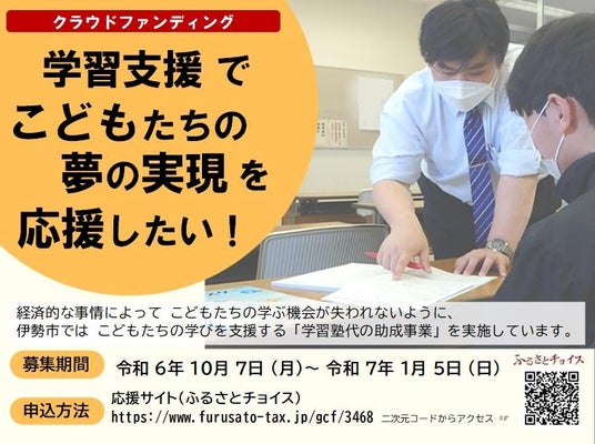 将来の就労や収入に大きな影響を与える「学び」。こどもたちが経済的な事情によって、学習の機会や進路選択をあきらめることがないように、伊勢市は生活困窮世帯の中学生に対し学習塾代の助成を行っています。このたび、ふるさと納税型クラウドファンディング(ガバメントクラウドファンディング)を実施し、皆さまからのご支援を募ります。