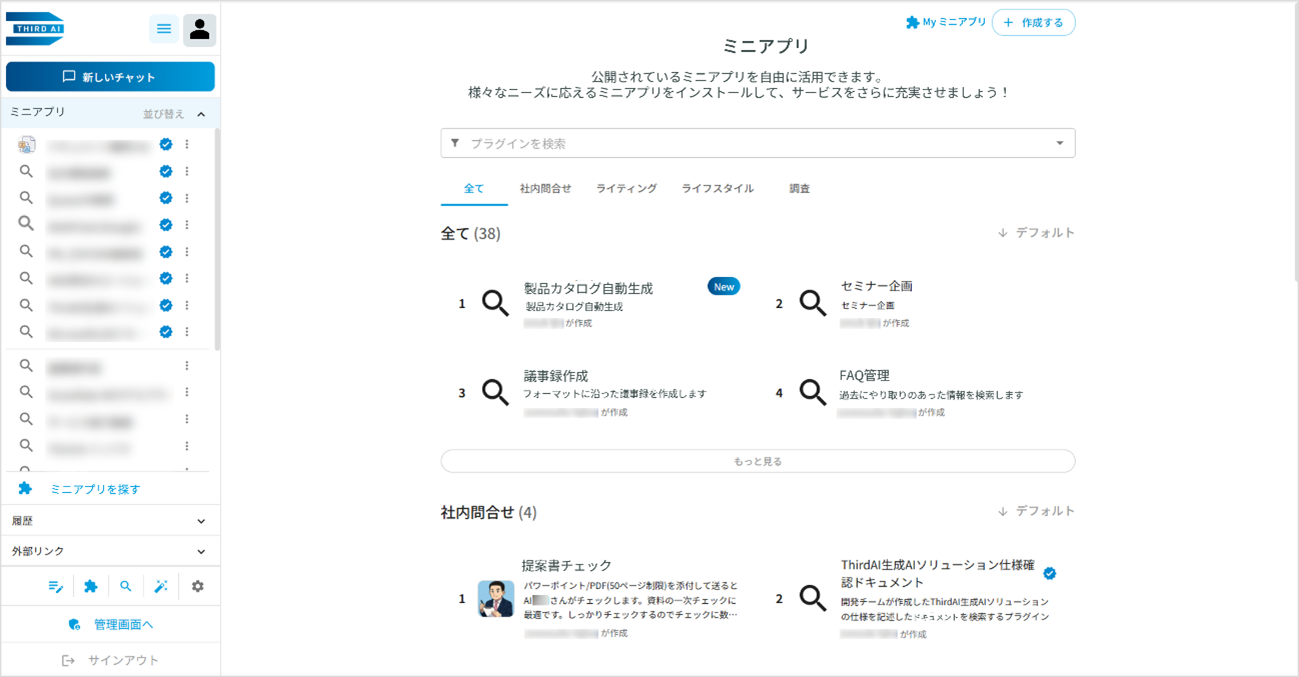 このような課題に対し、この度追加したミニアプリ機能では「Third AI 生成AIソリューション」のプラットフォーム上に業務アプリケーションを表示することで、汎用チャット機能と業務アプリケーションを1つの画面上で並行して操作できるようになります。ツール間の行き来や画面切り替えによる中断が減ることで、生成AIを「使いたい時にすぐ使える」状態に近づけ、現場での活用促進・定着が期待できます。