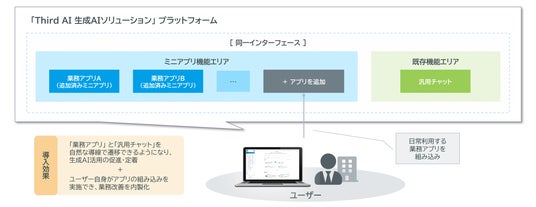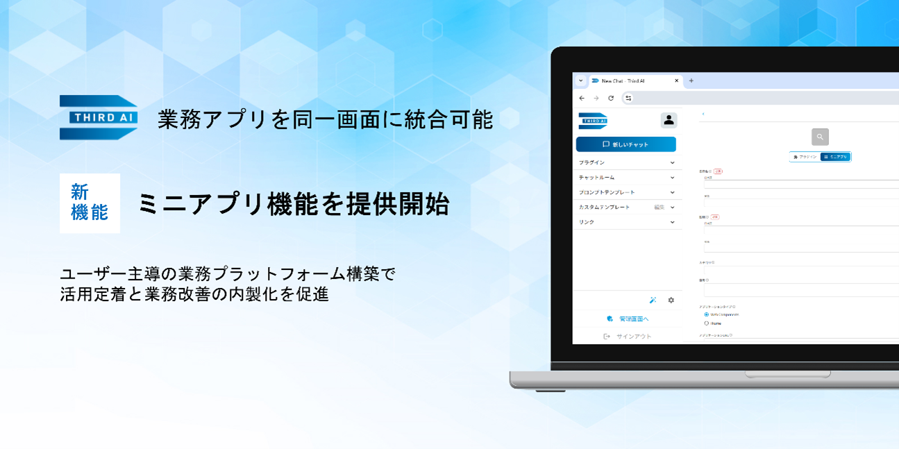 AIインテグレーションサービス「Third AI」を提供するJTP株式会社(本社:東京都品川区、代表取締役社長:森 豊、以下「JTP」)は、2026年3月10日、生成AIのビジネス活用を支援する「Third AI 生成AIソリューション」において提供しているAIプラットフォーム上に、ユーザーが日常業務で利用する各種Webアプリケーションを同一画面で操作可能にする「ミニアプリ機能」を追加したことをお知らせします。