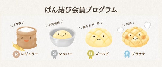 会員ランクはレギュラー、シルバー、ゴールド、プラチナの4種類あり、パンが焼きあがる工程をイメージしたイラストで楽しみながらランクアップできます。