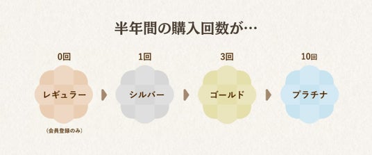 会員登録をするとレギュラー会員からスタートします。半年間の購入回数に応じてランクアップし、特典内容が充実していきます。