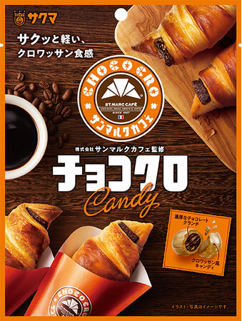 本商品は、サンマルクカフェの人気メニュー「チョコクロ」の味わいを再現した「クランチキャンディ」です。サクマ製菓は1970年生まれのロングセラー「いちごみるく」のクランチ製法を応用し、クロワッサンのようなサクッと軽い食感をキャンディで実現。「チョコクロ」をイメージした新感覚のキャンディをぜひお楽しみください。