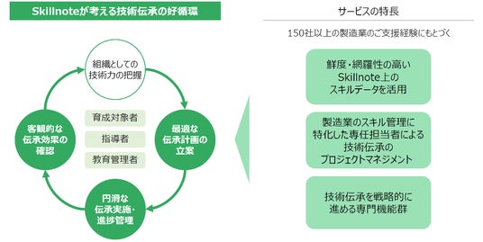 製造業のスキルマネジメントを牽引する株式会社Skillnote(本社 東京都千代田区、代表取締役 山川隆史、以下Skillnote)は、スキルマネジメントシステム「Skillnote」のユーザー企業向けに、同システムに保管されたスキルデータを活用しながら戦略的な技術伝承活動を支援する新たなサポートプログラム「技術伝承立ち上げ支援サービス」を2024年5月16日から提供開始することを発表します。