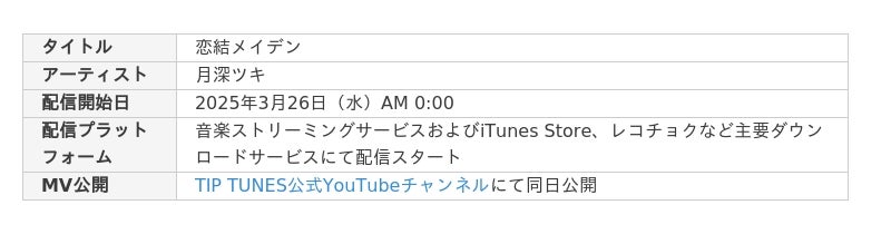 「V-TIPS」(ブイチップス)と、ビクターエンタテインメントによる新たな音楽プロジェクト「TIP TUNES」(読み:チップチューンズ)の第一弾オリジナル楽曲「恋結メイデン」が、2025年3月26日(水)AM0:00より各種音楽配信サービスにて配信開始されます。本楽曲は、アーティスト・月深ツキによる作品で、その独自の世界観と表現力が光る一曲となっています。TIP TUNES公式YouTubeチャンネルでは、ミュージックビデオ(MV)も同日21:00に公開します。