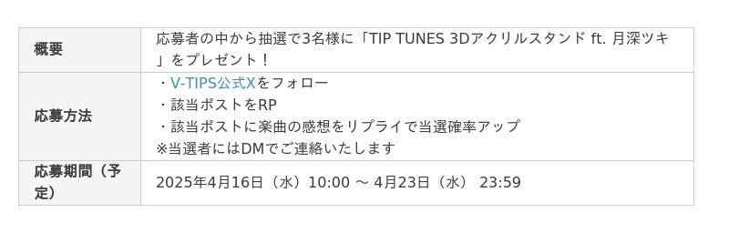 - “恋結メイデン”リリース記念「TIP TUNES 3D アクリルスタンド ft. 月深ツキ」販売決定!SNSプレゼントキャンペーンも開催! -