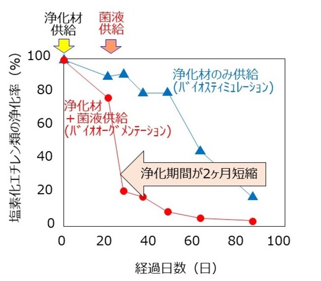 これら一連の開発した技術を用いて、大成建設は塩素化エチレン類で汚染された地盤にUCH007株の菌液を注入する浄化実証試験を行いました。その結果、菌液の注入直後から塩素化エチレン類は急速に減少し、従来の浄化材のみを用いる浄化技術(バイオスティミュレーション)と比べて浄化期間を約2ヶ月間短縮し、コストを約50%削減できることを実証しました(図5)。