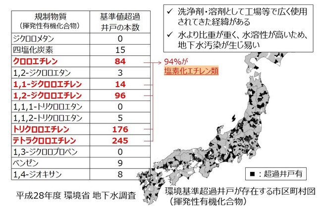 トリクロロエチレンなどの塩素化エチレン類は洗浄剤として幅広い業種で使用されてきました。塩素化エチレン類は、浸透性や水溶性の高さから地下水への汚染が生じやすく、我が国における主要な汚染物質になっています(図2)。