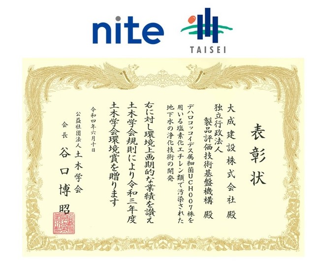 独立行政法人 製品評価技術基盤機構(以下、NITE(ナイト))[理事長:長谷川史彦、本所:東京都渋谷区]と大成建設株式会社[社長:相川善郎、本社:東京都新宿区]が共同実施した「デハロコッコイデス属細菌UCH007株を用いる塩素化エチレン類で汚染された地下水の浄化技術の開発」が、公益社団法人土木学会が主催する令和3年度土木学会環境賞を受賞し、6月10日に授与式が行われました。