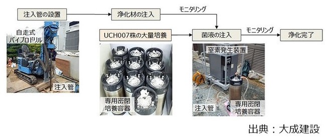 今回の技術開発において、 NITEは、浄化菌UCH007株の分離と大量培養方法の開発を担当し、大成建設株式会社は、浄化菌の注入方法の開発や実汚染現場における実証試験を担当しました。