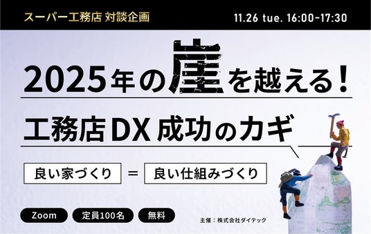 住宅業界のDX化を推進する株式会社ダイテック(本社:東京都品川区、代表取締役社長:野村明憲 以下、ダイテック)は、11月26日(火)に「スーパー工務店 対談企画 2025年の崖を越える!工務店DX成功のカギ『良い家づくり=良い仕組みづくり』」をオンライン開催いたします。