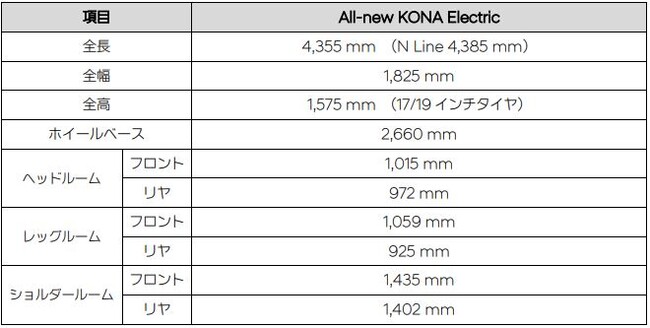 新型KONAは、先代KONAと比較して、ディメンションを拡大した独特のプロポーションとなっています。EVモデルをベースに、全長は2017年の先代より175mm長い4,355mmとなり、ホイールベースは60mm長い2,660mmとしました。全幅は25mm広い1,825mm、全高は20mm高い1,575mmとなります。