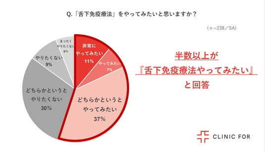 舌下免疫療法の未経験者238名に、「舌下免疫療法をやってみたいと思うか」調査した結果、半数以上が「やってみたい」と回答しました。