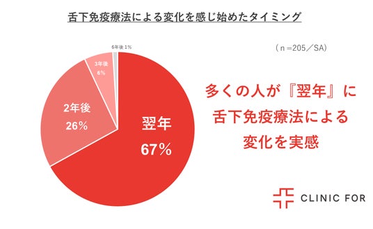 変化を感じ始めたタイミングについて調査した結果、「治療開始の翌年の花粉症シーズン(67%)」が最も多く、次いで「治療開始から2年後の花粉症シーズン(26%)」となりました。