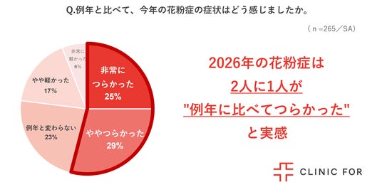 花粉症の方265名に、「例年と比べて、2026年の花粉症の症状はどう感じたか」を調査した結果、54%の人が「つらかった」と回答しました。
