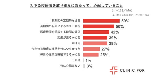 「舌下免疫療法をやってみたい」と回答した131名に、心配に感じている点について調査しました。その結果、最多が「長期間の定期的な通院(59%)」、次いで「長期間の服薬によるコスト負担(50%)」「医療機関を受診する時間の確保(42%)」挙げられました。