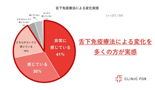 舌下免疫療法の経験者227名に対し、「舌下免疫療法により、変化を感じているか」を調査したところ、多くが変化を実感していると回答しました。