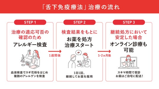「舌下免疫療法」は、治療の適応可否を確認するためのアレルギー検査(血液検査)と、検査結果を踏まえた初回のお薬の処方は対面診療での受診が必須です。(経過が安定している継続処方の方のみ、オンライン診療への切り替えが可能です)