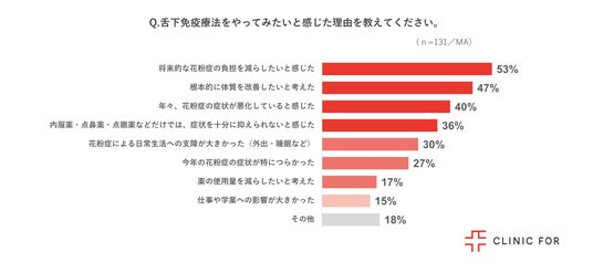 その理由として最も多かったのは「将来的な花粉症の負担を減らしたいと感じたため(53%)」、次いで「根本的に体質を改善したいと考えたため(47%)」、「年々、花粉症の症状が悪化していると感じるため(40%)」、「内服薬・点鼻薬・点眼薬などだけでは、症状を十分に抑えられないと感じたため(36%)」が続きました。