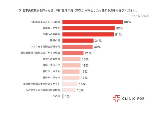 さらに、特に生活の質(QOL)が向上したと感じる点としては、「花粉症によるストレスの軽減(60%)」「外出のしやすさ(52%)」「仕事への集中力の向上(51%)」が上位に挙げられました。