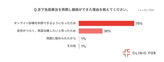 舌下免疫療法の治療を中断し、再開したことがある43名に、治療の継続ができた理由について質問した結果、最多が「オンライン診療を利用できるようになったため(70%)」次いで「症状がつらく再度治療したいと思ったため(30%)」となりました。