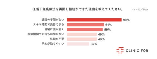 さらに「オンライン診療が舌下免疫療法の継続に影響したと回答した」41名に、オンライン診療のどの点が、継続につながったと感じるかどうか質問したところ、「通院の手間がない(90%)」「スキマ時間で受診できる(61%)」「自宅にお薬が届く(59%)」となりました。オンライン診療の利便性が治療継続の鍵になっていることがわかりました。
