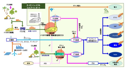 2024年1月からスタートしている中期経営計画2026を推進する4つの事業セグメントのひとつであるエネルギー&ライフラインセグメントでは「脱炭素・資源循環型社会の実現」のため、1.カーボンニュートラル事業、2.再エネ促進事業、を主要戦略課題として取り組んでいます。2050年カーボンニュートラル実現の為、バイオマス発電設備のボイラ排ガスから、いわゆるグリーンCO2を回収する技術、あるいはバイオマスガス化炉で合成ガスを製造する技術により、ジェット燃料(SAF)や化学原料のサプライチェーンに参画することによって、カーボンリサイクルを普及・促進していく社会を目指していきます。