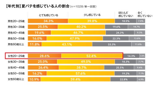 - 今年、例年より暑いと感じる人は75.6%。今年夏バテを感じた人は約7割。年代別で見ると、最も夏バテを実感しているのは20代女性で、8割以上が実感あり。
