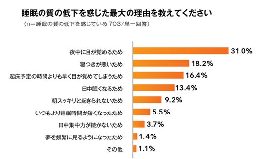 睡眠の質の低下を感じた最大の理由について伺うと、「夜中に目が覚めるため」「寝付きが悪いため」「起床予定の時間よりも早く目が覚めてしまうため」という回答が上位に上がりました。