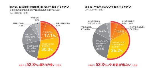 ■半数以上(52.8%)が眠りが浅いと回答。また、やる気が出ないと回答した人も半数(53.3%)以上に