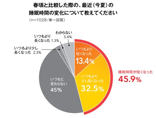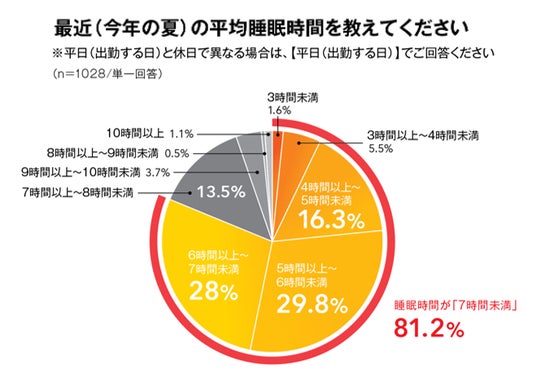 - 今夏の平均睡眠時間は、専門家が推奨する睡眠時間「7時間」に達していない人は81.2%も。春頃より睡眠時間が短くなった人は約半数(45.9%)。