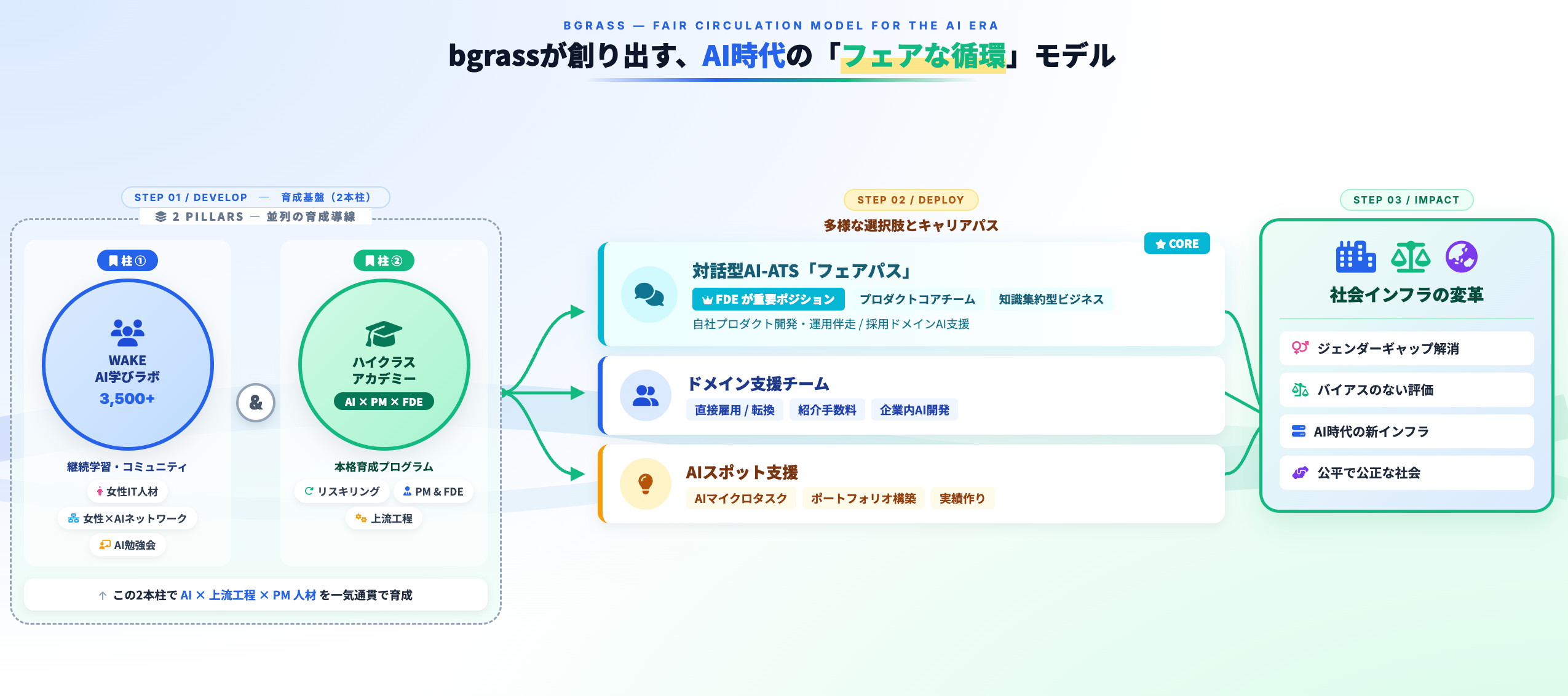 bgrass株式会社(本社:東京都渋谷区、代表取締役:咸 多栄、以下「当社」)は、AI時代の現場課題を解決するため、FDE(Forward Deployed Engineer)を主体としたIT人材育成と、スキルを持ったIT人材による多様な業務課題の解決に向けた人材事業を展開します。また、それらで得られた人材の実戦知を基に、様々なドメイン(業務領域)に対するソリューションの開発と提供を進め、AI/DXを推進します。