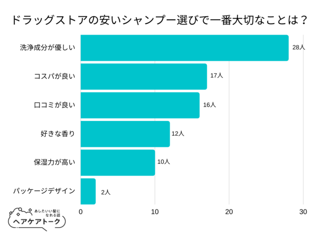 「ドラッグストアの安いシャンプー選びで一番大切なことは?」とアンケート調査した結果、1位は『洗浄成分が優しい』でした。