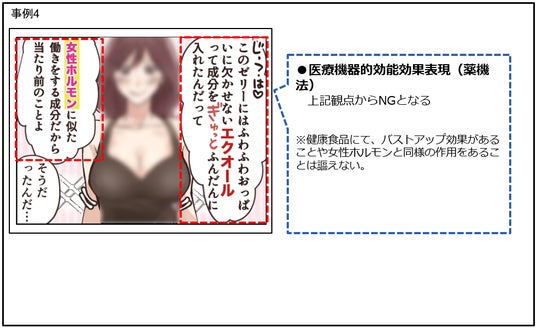 例:目のコントラスト感度を改善する機能に対して眼鏡が必要なくなるかのような訴求表現、BA画像や対比画像などを用いて視力が改善されると誤認させるような表現、脂肪便や代謝を高める機能、あたかも体質改善がなされてリバウンドしないと誤認させるような表現、「永久に歩ける」及び、杖なしでスムーズに歩けるようになったBA画像等、歩行能力が維持ないし向上できる程度を誤認させる、過度な表現
