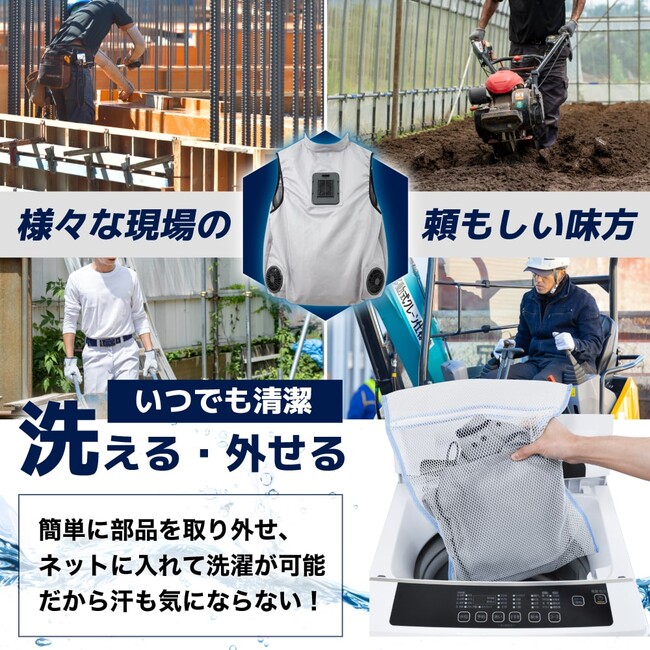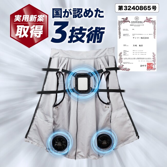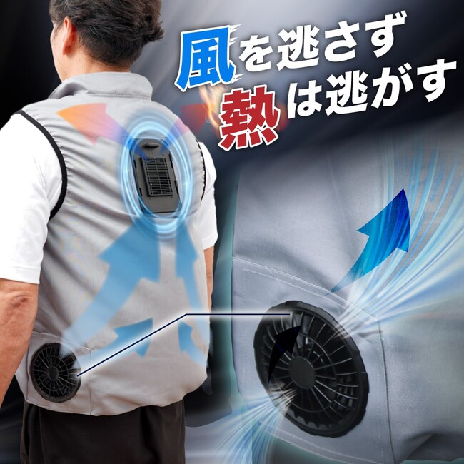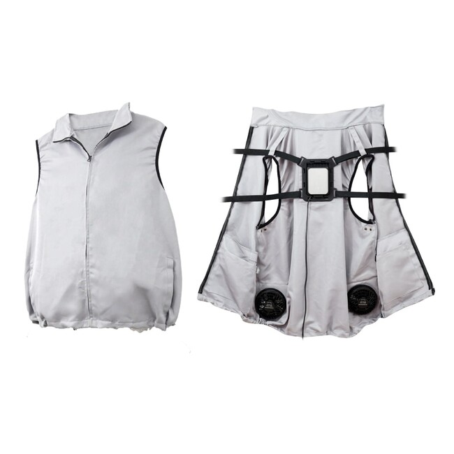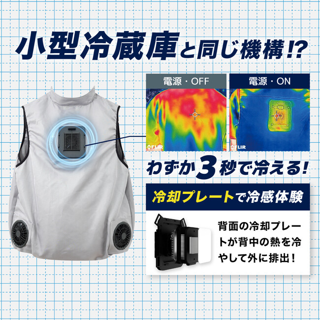 フリーサイズで男性の普段着用サイズM~XLまで対応。背中の部分に小型冷蔵庫などに搭載されるペルチェ冷却システムを採用。電気を入れると外気温から-15度に冷やされた冷却プレートが背中の部分と密着し直接冷たく感じる「ペルチェ冷却」を搭載。左右それぞれに搭載されたファンで外気を取り込みベストの内部に風が循環し汗を蒸発し涼しくなる「気化熱」とのWの効果により約3秒で体を冷却。暑い夏でも快適に過ごすことが可能です。実用新案(第3240865号)を取得。