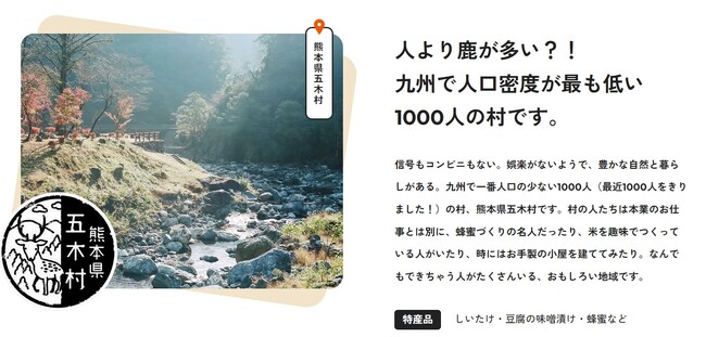 五木村は熊本県の南部、人吉・球磨地方にあります。村全体が九州山地の山岳地帯にあり、標高1000m以上の山岳が連なる急峻な地形と、15年連続で「水質が最も良好な河川」に選ばれる川辺川が流れる豊かな森と水の村です。人口は約1000人で、村内に小中学校は一校のみ、川を沿うように走る国道と県道には、信号がありません。スーパーやコンビニもなく、毎日の買い物は道の駅と古くからの商店が頼りの昔ながらの暮らしを営んでいる村です。