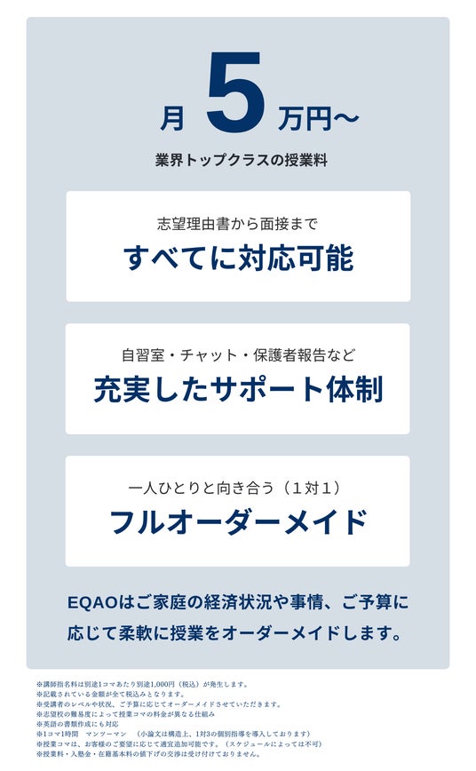2021年創業の総合型選抜入試・学校推薦型選抜入試の老舗EQAOが、総合型選抜対策コースの2月入塾枠の受け入れを開始したことをリリースさせていただきます。「受け入れ開始:1月20日~」オンライン校または本校舎からお選びいただけます。自己分析から、実績づくり、小論文、プレゼンテーション、面接、グループディスカッションなど、全てをプロの講師陣と一緒に対策していきましょう。※EQAOでは、受験資格となる英検の対策も専門で行っておりますので、推薦入試対策と並行して対策可能です。