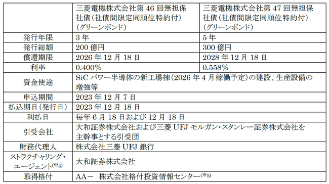 三菱電機株式会社は、2023年11月10日に公表(※1)した公募形式によるグリーンボンド(以下、本社債)の発行条件を以下のとおり決定しました。本社債の発行により調達した資金は、SiCパワー半導体の新工場棟(2026年4月稼働予定)の建設や生産設備の増強等(※2)に充当します。