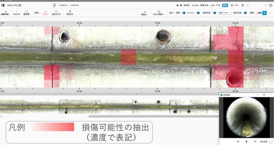 我が国の下水道インフラは、老朽化や損傷による機能不全のリスクが高まっており、下水道管路の点検が急務です。近年は、点検の費用や時間を抑えるため、スクリーニング調査により広範囲を迅速に簡易点検し、損傷の可能性がある箇所のみを詳細調査することが主流になっています。このスクリーニング調査は、カメラ搭載機器が管内を走行して撮影した動画を熟練技術者が事務所等で目視点検することが一般的ですが、目視点検を行う熟練技術者が慢性的に不足しているため、省力化・省人化が課題でした。
