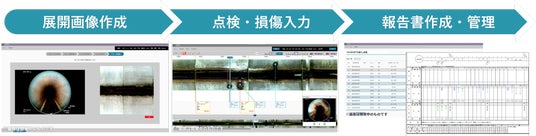 「スマカン」は、広角展開式カメラで撮影した下水道管路内の動画を帯状の画像にする「展開画像の作成」から、熟練技術者による「点検・損傷判定結果の入力」、「調査報告書の出力」までをワンストップで行うことができるソフトウェアです。