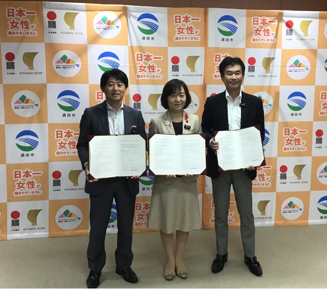 *写真左から、NTTデータ イントラマート 中山 義人 社長、酒田市 矢口 明子 市長、当社 取締役 藤井 泉智夫