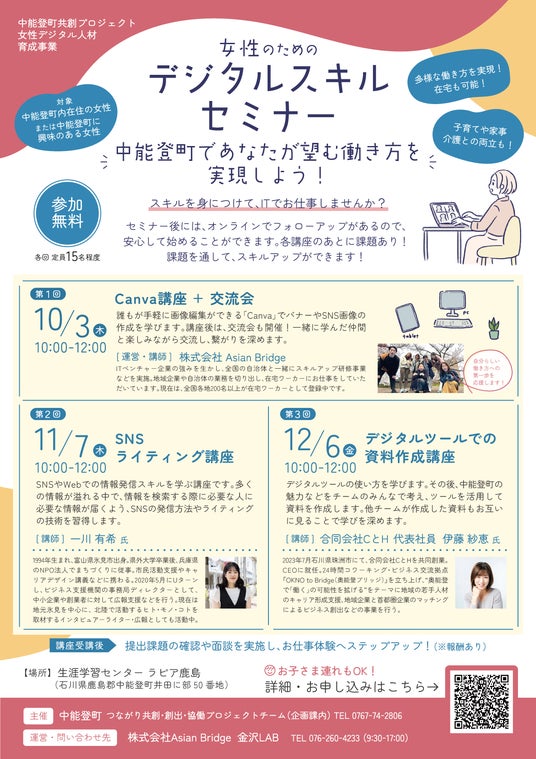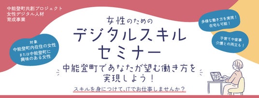 石川県中能登町(運営:株式会社Asian Bridge)では、中能登町及び周辺地域の女性を対象として、デジタル分野で活躍する人材育成のため、在宅ワークに必要なデジタルスキル等の習得を目指すセミナーを10月より開催しています。