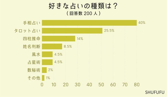 好きな占いの種類は?の問いに対して最も多かったのが「手相占い(40%)」でした。 次いで「タロット占い(25.5%)」「四柱推命(14.%)」という結果でした。