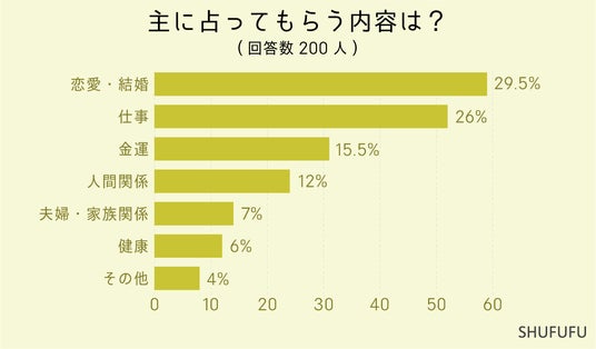 主に占ってもらう内容は?に関しては1位「恋愛・結婚(29.5%)」、2位「仕事(26%)」でした。「恋愛・結婚」を選んだ年代では20代からの回答割合が特に高かったです。