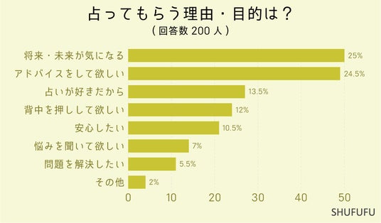 占ってもらう理由・目的は?を尋ねたところ、1位は「将来・未来が気になる(25%)」、2位「アドバイスをして欲しい(24.5%)」となりました。これから自分の人生がどうなっていくのか、少しでも参考になる話が聞きたいですよね。