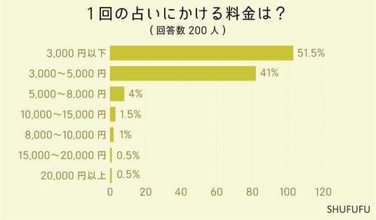 1回の占いにかける料金は?を尋ねたところ、1位は「3,000円以下(51.5%)」、2位「3,000~5,000円(41%)」となりました。ショッピングモールなどでも占いコーナーはありますし、数千円なら気軽に占ってもらえそうですね。