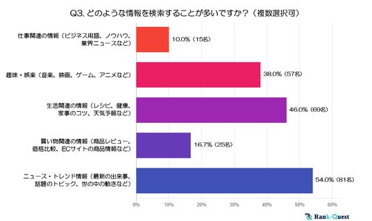 次いで「生活関連の情報」46%をよく検索しており、レシピや健康、家事のコツなど日常生活を支える情報を積極的に取り入れているようです。
