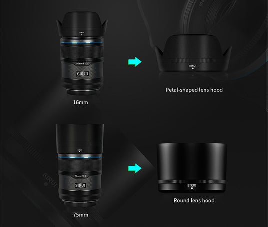 16mmの焦点距離レンズには花びら型のレンズフード、75mmの焦点距離レンズには丸型のレンズフードが付属しており、ビネット効果を減少させ、不要なストレイライトの侵入を防ぎます。また、レンズフードの取り付けと取り外しも非常に簡単です。