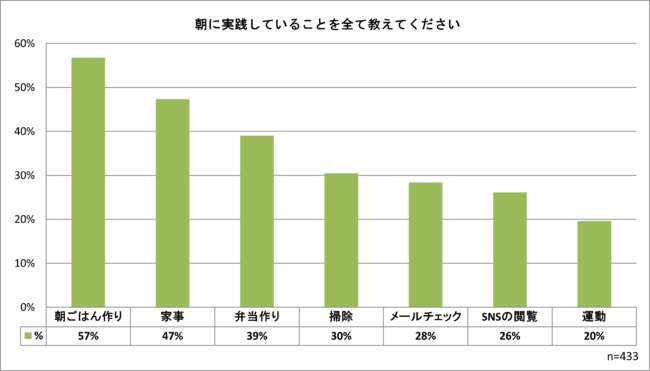 朝に実践していること、朝ごはん作り、家事、弁当作りが上位。運動も20%まで伸長
